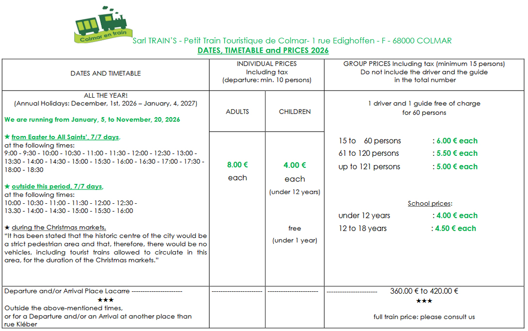 The Little Green Train offers professionals, individuals, families or groups, a tourism circuit by train for a visit to explore Colmar (Alsace).