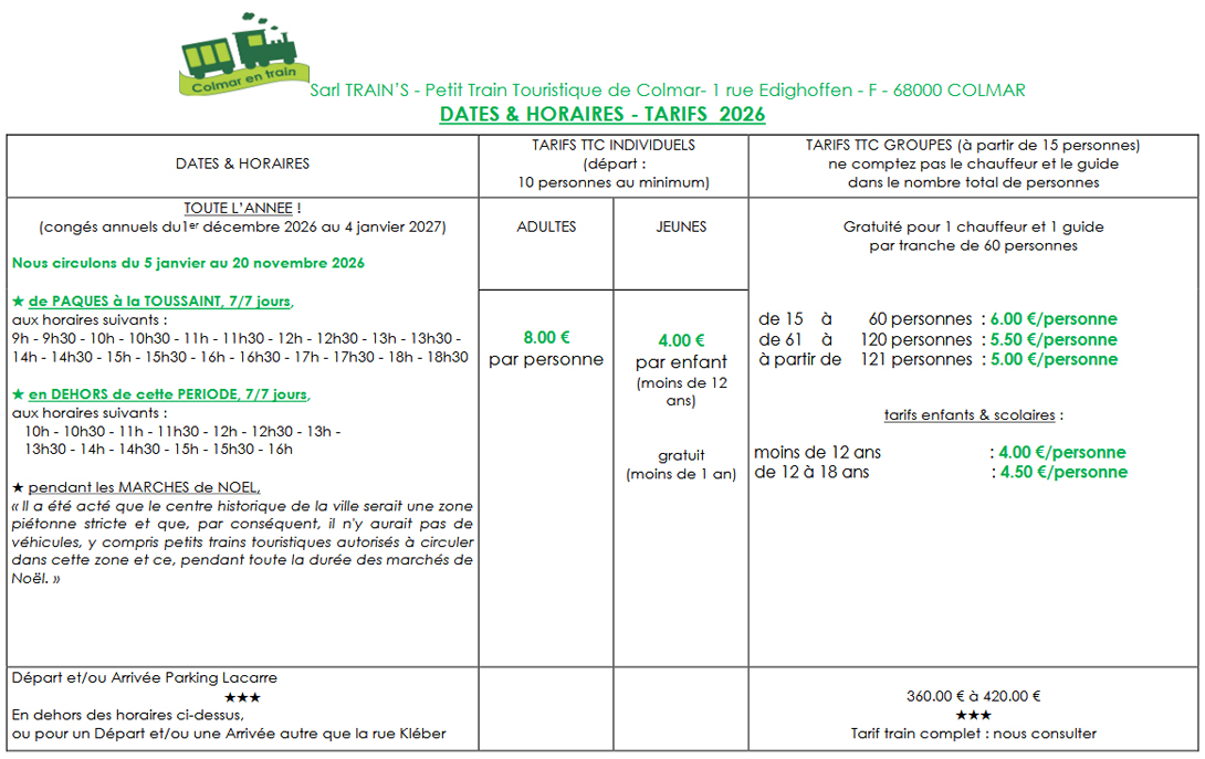 Le Petit Train Vert propose aux professionnels pour les groupes, aux particuliers seuls, en famille ou entre amis, un circuit de tourisme en train pour une visite à la découverte de Colmar (Alsace) en Train.